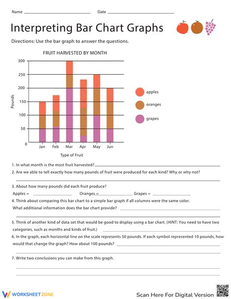 You may select the difficulty of the graphing task. Students will examine a graph of fruit harvested by month, then answer seven questions designed to support them. Web bar graph worksheets contain counting objects, graphing by coloring, comparing tally marks, creating graph, reading bar graph, double bar graph, drawing bar graph to represent the data, making your own survey and more.